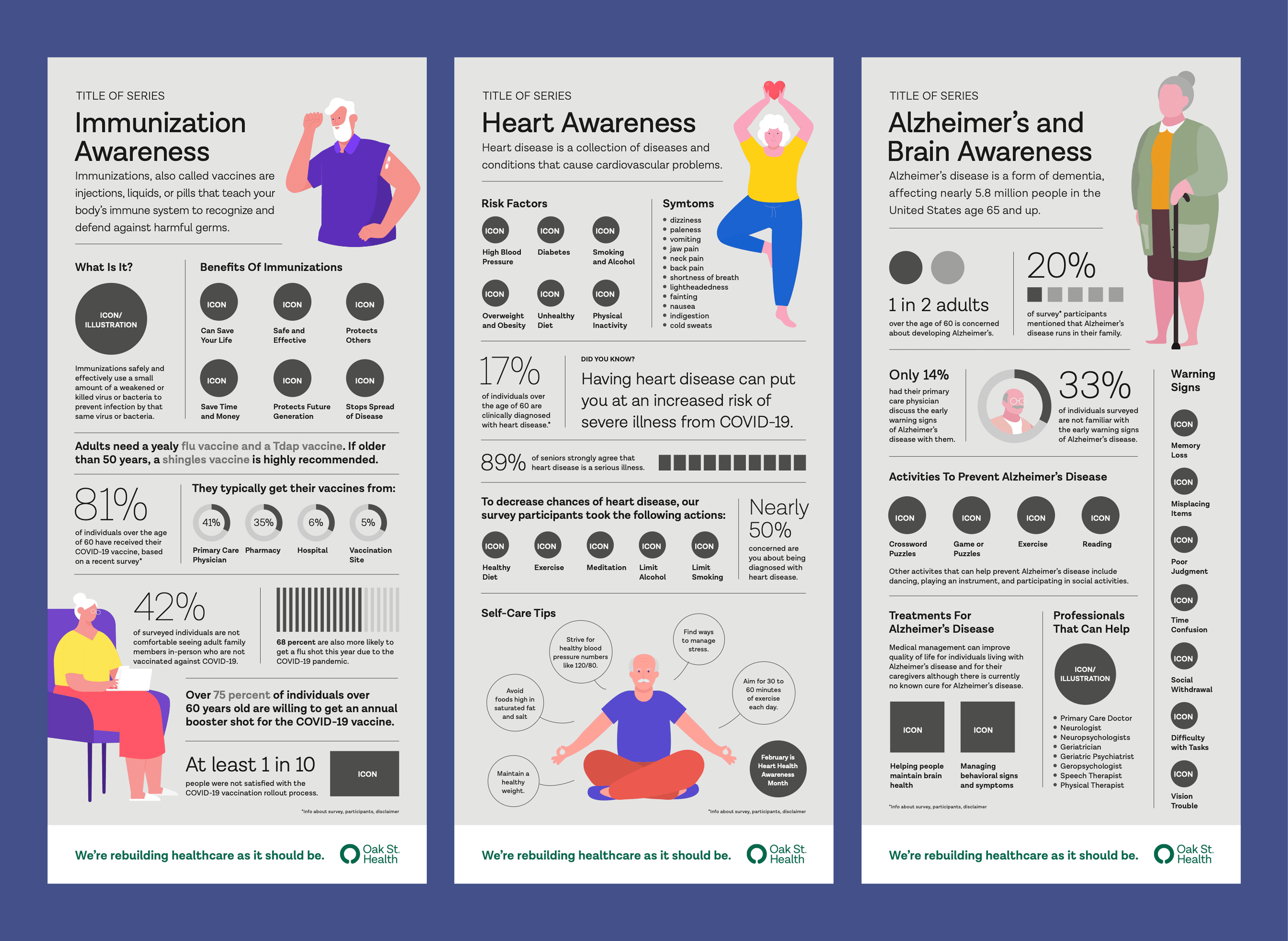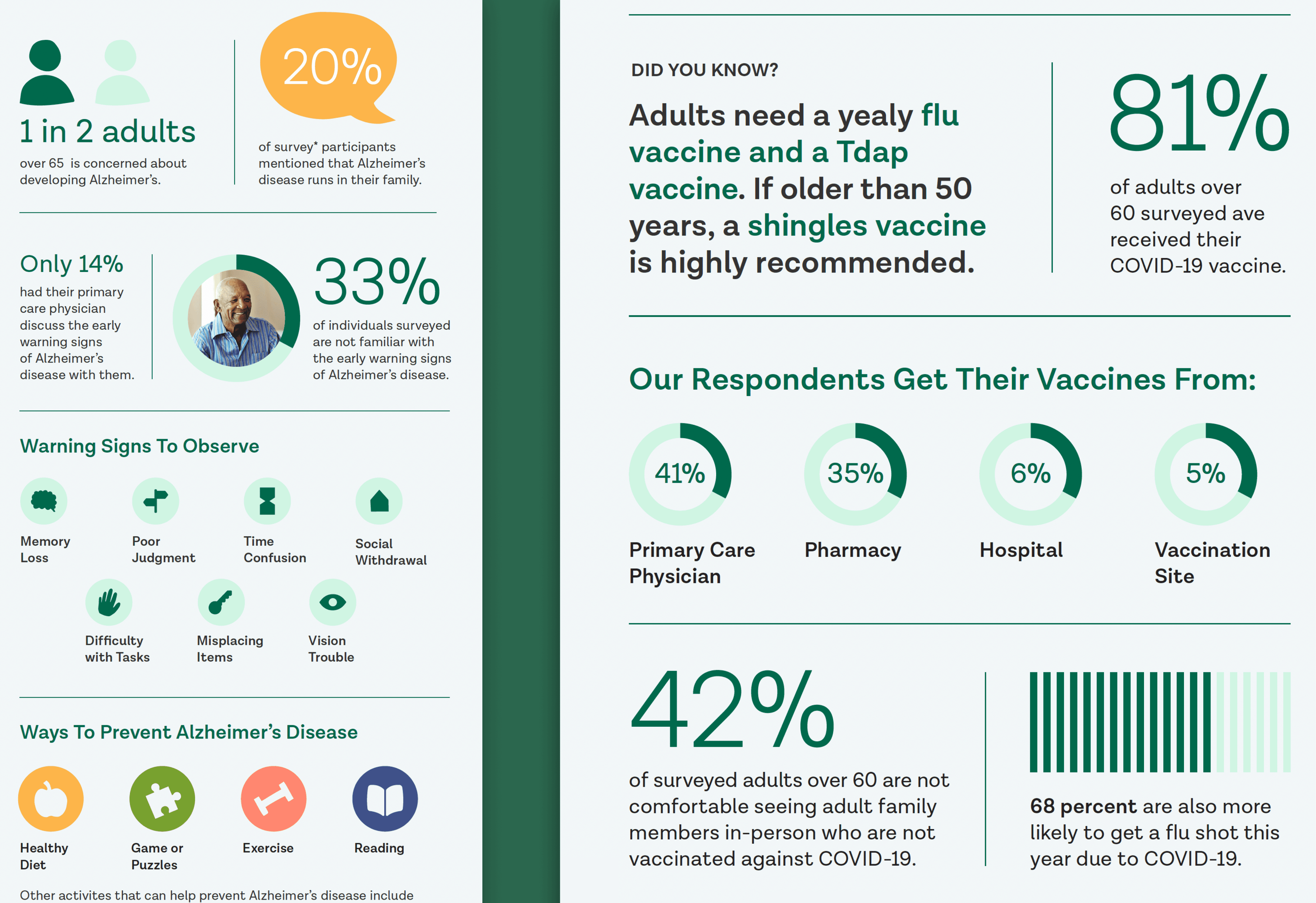 This series of infographics was created to promote health awareness and preventive care among older adults, with a focus on Alzheimer's disease, heart health, and immunizations.