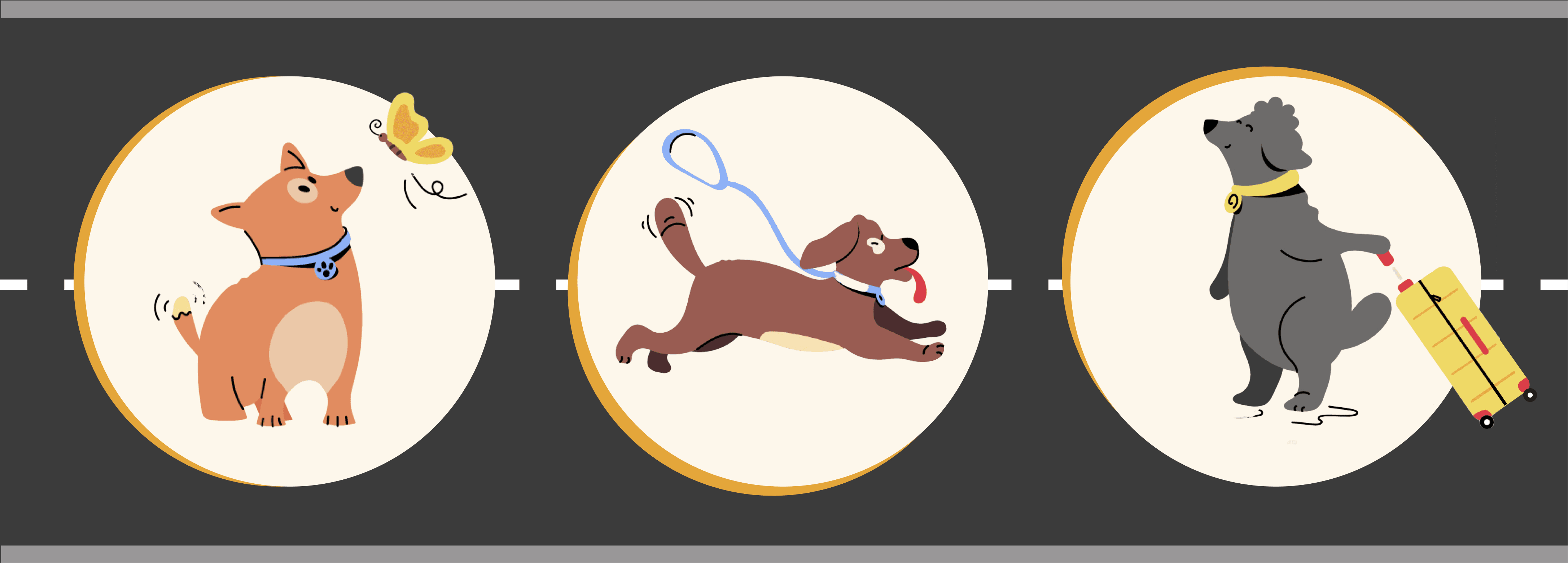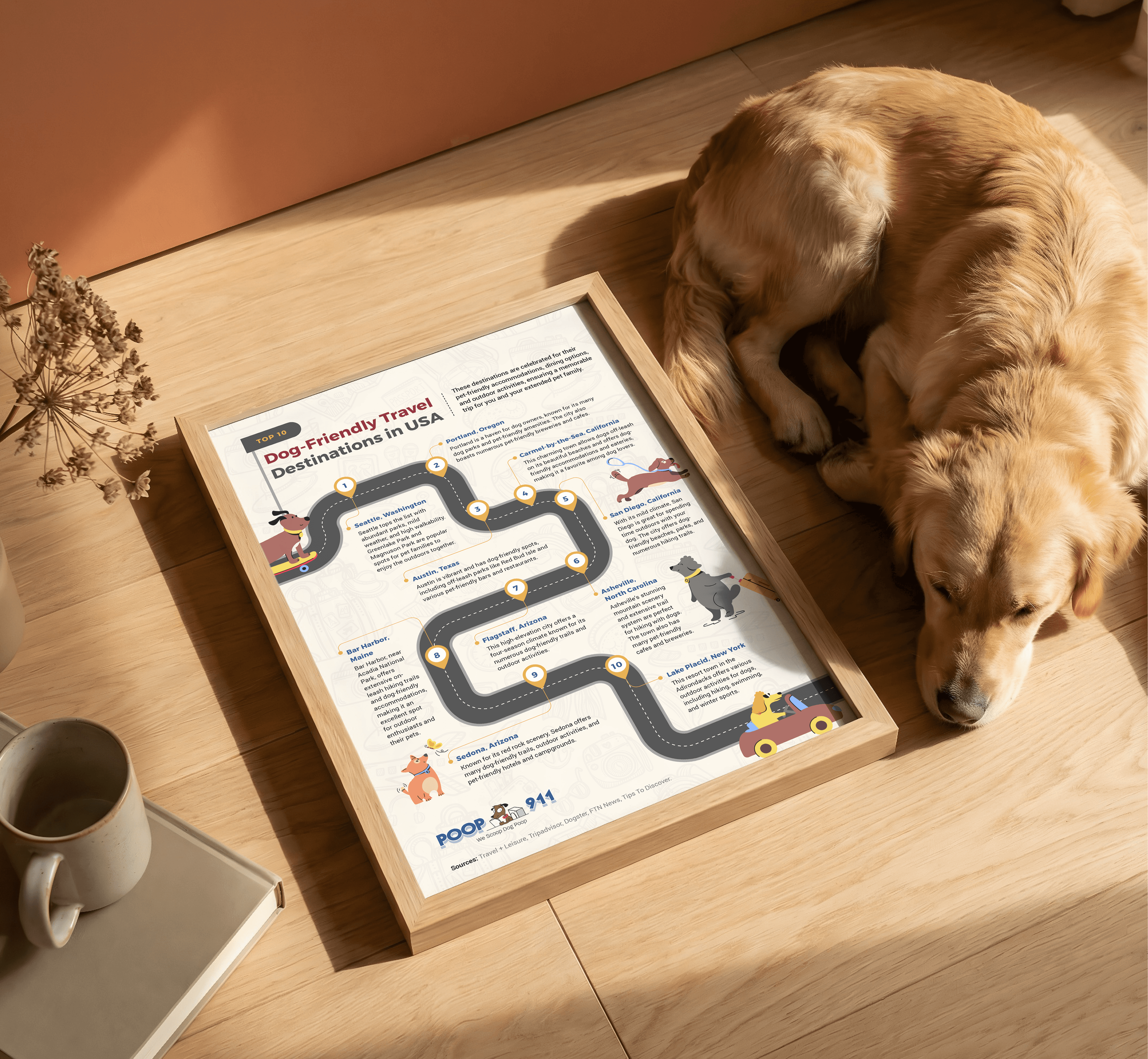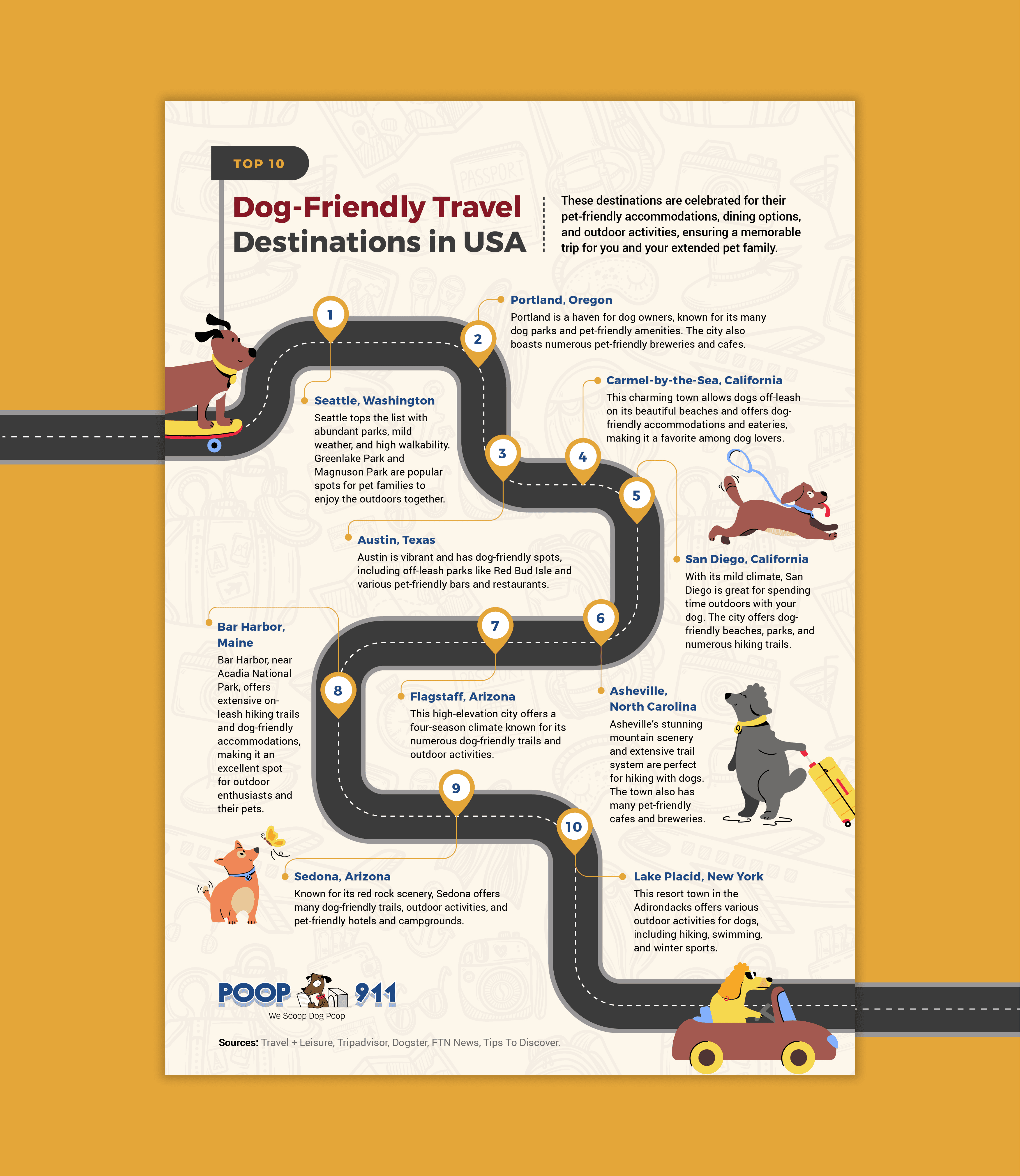 The pieces leaned fully into the brand's playful personality, with illustrated dog characters, bright palettes, and layouts designed to hold attention while delivering genuinely useful information. The winding road format of the travel destinations piece gave the content a sense of journey and momentum, while the tips infographic used a flowing path structure to keep readers engaged.